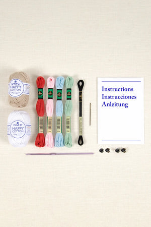Il kit include il prestigioso filato DMC Happy Cotton in 100% cotone, specificamente progettato per gli amigurumi, insieme a tutti gli accessori e le istruzioni multilingue per guidarti nel processo.